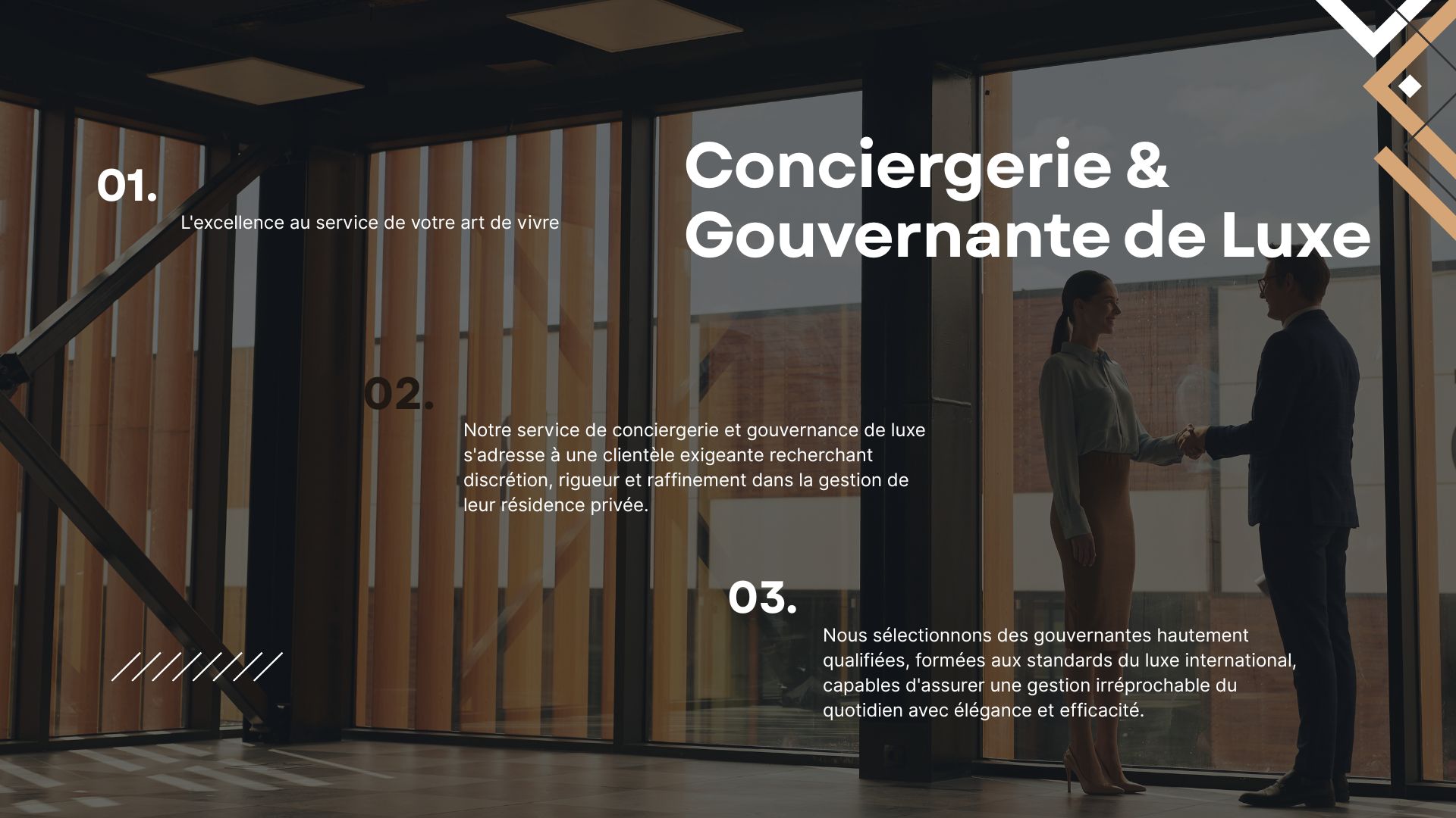 Conciergerie & Gouvernante de Luxe vous offre l'excellence au service de votre art de vivre. Conçu pour une clientèle exigeante, notre programme sur mesure garantit discrétion absolue, rigueur et raffinement dans la gestion de votre résidence privée. Nous recrutons et plaçons des gouvernantes de haut niveau, formées aux standards internationaux du luxe, pour orchestrer un quotidien impeccable : coordination des tâches ménagères, supervision du personnel, protocole, accueil des invités, entretien des vêtements et logistique, avec une élégance discrète, une précision proactive et une confidentialité absolue.